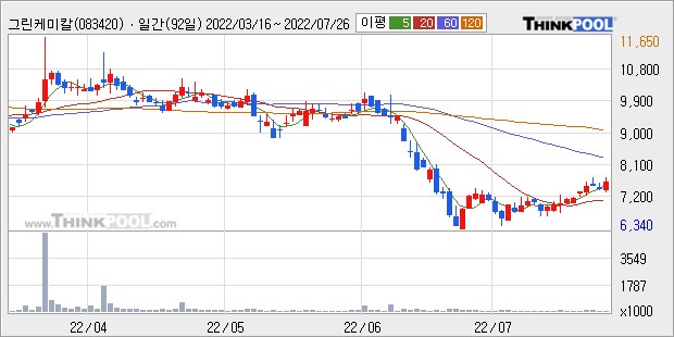 그린케미칼의 2021년 매출액은 전년대비 18.1% 늘어난 2862억원이고, 영업이익 또한 전년대비 41.7% 늘어난 208억원을 기록했다. 이 회사의 매출액 증감률과 영업이익 증감률은 각각 코스피 상위 39%, 상위 42%에 해당된다.