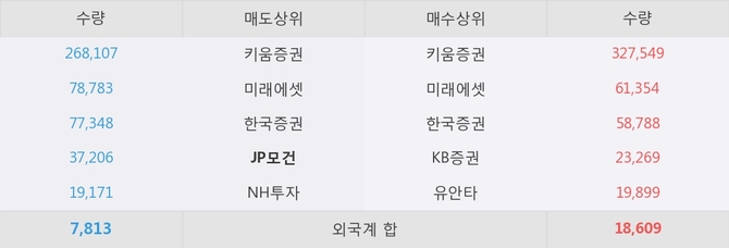 이 시각 주요 거래원은 미래에셋, 키움증권, 한국증권 등이 매수 상위 창구에 자리하고 있다. 한편, 매도 창구 상위에는 JP모건이 눈에 띄고 있다.