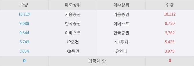 이 시각 주요 거래원은 NH투자, 키움증권, 이베스트 등이 매수 상위 창구에 자리하고 있다. 한편, 매도 창구 상위에는 JP모건이 눈에 띄고 있다.