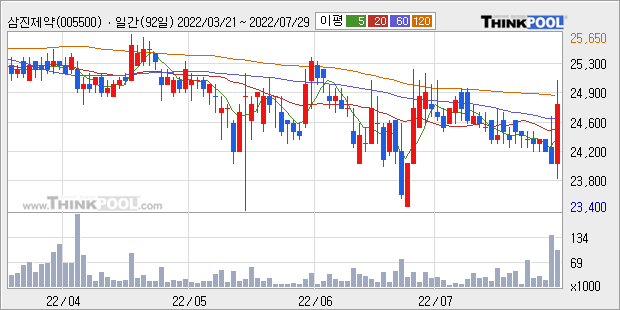 삼진제약은 2021년 매출액 2501억원과 영업이익 339억원을 기록했다. 전년대비 매출은 6.3%, 영업이익은 5.2% 각각 상승했다. 이 회사의 매출액 증감률과 영업이익 증감률은 각각 코스피 하위 32%, 하위 41%에 해당된다.
