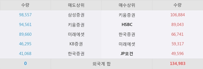 거래원 동향은 HSBC, JP모건, 미래에셋 등이 매수 상위 목록에 위치하고 있다.