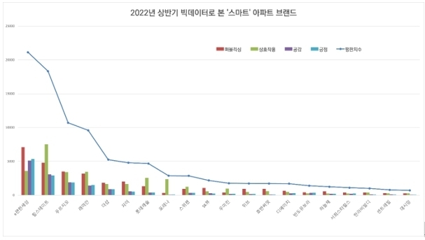 이번 분석에서 조사된 아파트 브랜드는 e편한세상, 힐스테이트, 푸르지오, 래미안, 더샵, 자이, 롯데캐슬, 포레나, 스위첸, SK뷰 등 20개다.