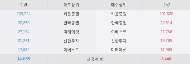 이 시각 주요 거래원은 미래에셋, 키움증권, 한국증권 등이 매수 상위 창구에 자리하고 있다.