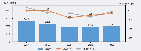 일지테크의 2021년 매출액은 1958억으로 전년대비 2.2% 상승했고, 영업이익은 -53억으로 전년에 이어 적자가 지속됐다. 이 회사의 매출액 증감률과 영업이익 증감률은 각각 코스닥 하위 29%, 상위 41%에 해당된다.