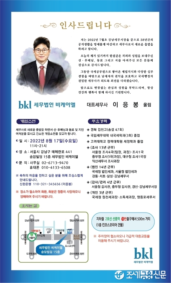 (조세금융신문=김영기 기자) 38년간 국세청에서 봉직하다가 지난 7월초 후진을 위해 용퇴한 이응봉 전 강남세무서장이 세무법인 비케이엘 대표세무사로서 힘찬 ‘제2의 인생’을 새롭게 개척한다.