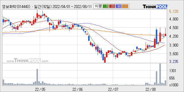 영보화학은 2021년 매출액 997억원과 영업이익 59억원을 기록했다. 전년대비 매출은 -7.1% 하락했고, 영업이익은 34.2% 상승했다. 이 회사의 매출액 증감률과 영업이익 증감률은 각각 코스피 하위 10%, 상위 45%에 해당된다.