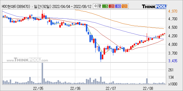 차트상 주가의 흐름은 현재 단기·중기 이평선이 정배열 상태로 전형적인 상승세를 보이고 있다. 최근 이 종목의 차트에서 캔들패턴(상승반전형), 최근 5일 매물대 돌파 등의 특이사항이 발생했다.