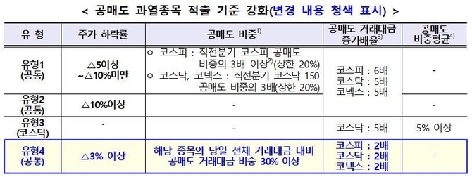거래소는 공매도 과열 종목 적출 기준을 신설해 해당 종목의 공매도 비중 30% 이상, 주가 하락률 3% 이상, 공매도 거래대금 증가율 2배 이상을 동시에 충족하는 경우 공매도 과열 종목으로 지정하기로 했다.