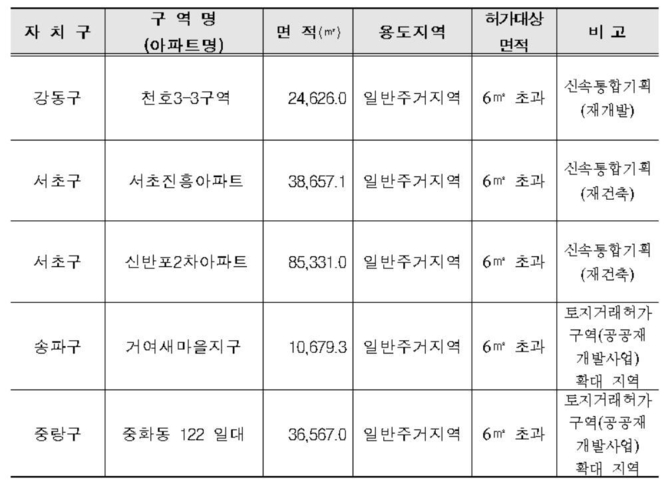 송파구 거여새마을지구와 중랑구 중화동 122일대는 정비구역 정형화 등 구역 변경에 따라 지난 4월 4일 지정한 허가구역 지정 범위를 이번에 확대했다. 이에 따라 기존의 토지거래허가구역과 지정 기간을 일치시켰다.