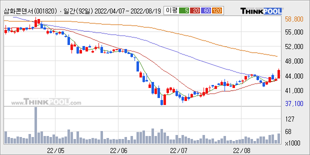 차트상 주가의 흐름은 단기간에 골든크로스를 만들고 주가가 60일선까지 뚫고 가는 모습이다. 이 종목의 차트에서 최근에 삼선전환도(양전환) 등을 확인할 수 있다