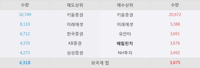 거래원 동향은 메릴린치, 미래에셋, NH투자 등이 매수 상위 목록에 나타나고 있다.