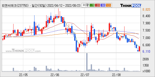피앤씨테크의 2021년 매출액은 전년대비 10.5% 늘어난 217억원이고, 영업이익 또한 전년대비 80.7% 늘어난 20억원을 기록했다. 이 회사의 매출액 증감률과 영업이익 증감률은 각각 코스닥 하위 45%, 상위 30%에 해당된다.