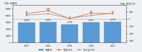 최근 실적을 살펴보면 2021년 매출액이 최근 5년 중 가장 높은 실적을 기록했음을 알 수 있다. 이전 최고 실적이었던 2018년 보다도 1.2%(37억 9천만원) 늘어난 것으로 나타났다.