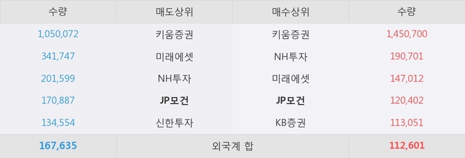 거래원 동향은 JP모건, NH투자, 미래에셋 등이 매수 상위 목록에 나타나고 있다. 한편, 매도 창구 상위에는 JP모건이 눈에 띄고 있다.