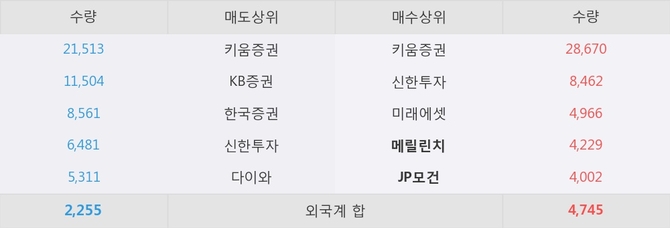 거래원 동향은 메릴린치, JP모건, 미래에셋 등이 매수 상위 목록에 위치하고 있다.