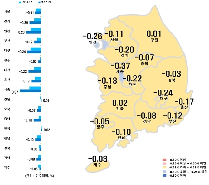 수도권(-0.18%), 서울(-0.11%) 5대광역시(-0.16%), 8개도(-0.06%), 세종(-0.37%) 모두 하락폭이 확대됐다.