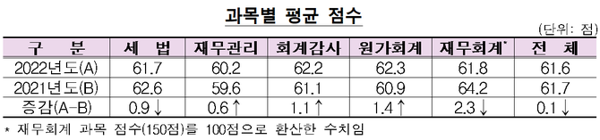 과목별로는 전반적으로 평점 60점을 넘긴 가운데 지난해와 거의 비슷한 난이도를 유지했으나, 재무회계는 평점 2.3점 내려간 61.8점을 기록하면서 지난해보다 소폭 난이도가 상승했다.