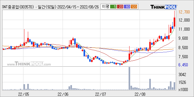 SNT중공업은 2021년 매출액 3360억원과 영업이익 206억원을 기록했다. 전년대비 매출은 11.3%, 영업이익은 51.1% 각각 상승했다. 이 회사의 매출액 증감률과 영업이익 증감률은 각각 코스피 하위 45%, 상위 38%에 해당된다.