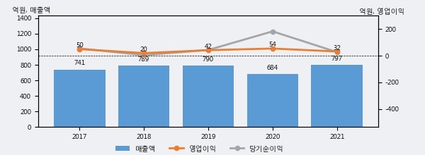 최근 실적을 살펴보면 2021년 매출액이 최근 5년 중 가장 높은 실적을 기록했음을 알 수 있다. 이전 최고 실적이었던 2019년 보다도 0.8%(6억 3천만원) 늘어난 것으로 나타났다.