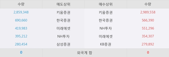 아직까지 외국계 증권사 창구를 통한 매매는 발생하지 않고 있다. 그리고 이 시간 한국증권이 매수창구상위에 올라있는 종목은 이 종목 이외에도 한국콜마홀딩스, 삼성 레버리지 WTI원유 선물 ETN 등이 있다.