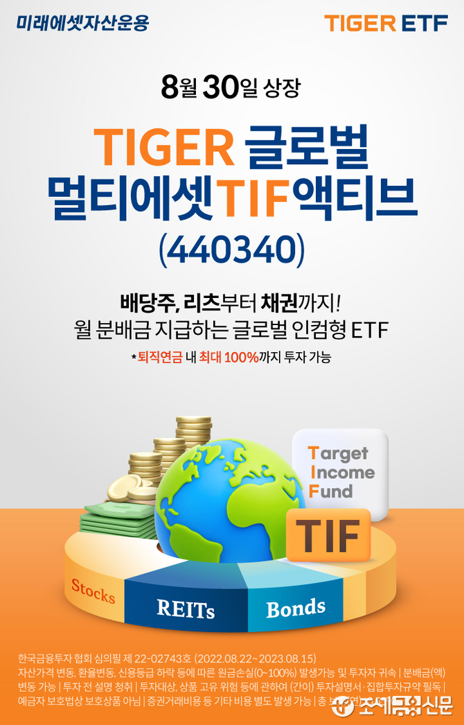 미래에셋 관계자는 "국내 첫 TIF ETF 상품으로, 자산군을 미국 주식·채권, 신흥국 국채, 글로벌 리츠 등 10개로 분류해 분산 투자한다"면서 "월 분배 상품이어서 매달 분배금을 생활비나 재투자 재원으로 활용할 수도 있다"고 설명했다.