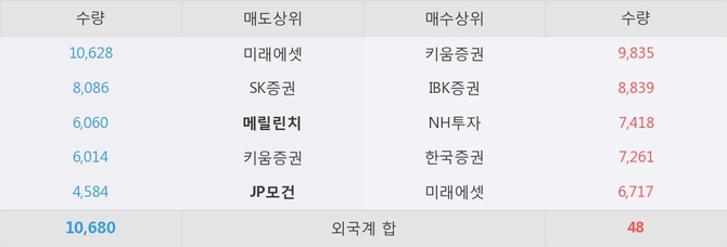 거래원 동향은 메릴린치, JP모건, 미래에셋 등이 매도 상위 목록에 위치하고 있다.
