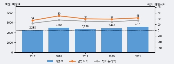 최근 실적을 살펴보면 2021년 매출액이 최근 5년 중 가장 높은 실적을 기록했음을 알 수 있다. 이전 최고 실적이었던 2018년 보다도 3.6%(89억 7천만원) 늘어난 것으로 나타났다.