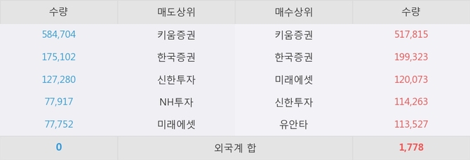 이 시각 주요 거래원은 미래에셋, 키움증권, 한국증권 등이 매수 상위 창구에 자리하고 있다.