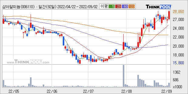 삼아알미늄의 2021년 매출액은 2530억으로 전년대비 28.4% 상승했고, 영업이익 또한 154억으로 전년대비 109.3% 상승했다. 이 회사의 매출액 증감률과 영업이익 증감률은 각각 코스피 상위 24%, 상위 25%에 해당된다.
