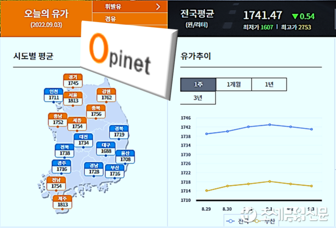 3일 한국석유공사 유가정보시스템 오피넷에 따르면 8월 다섯째 주(8.28∼9.1) 전국 주유소 휘발유 평균 판매가격은 전주보다 3.5원 내린 L당 1천740.3원으로 집계됐다.