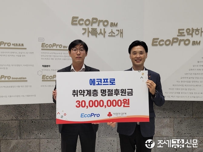 (조세금융신문=김종태 기자) 이차전지 양극재 생산기업인 에코프로는 추석을 앞두고 경북사회복지공동모금회에 취약계층 후원금 3천만원을 기부했다.