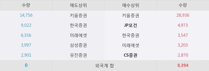 거래원 동향은 JP모건, CS증권, 미래에셋 등이 매수 상위 목록에 위치하고 있다.