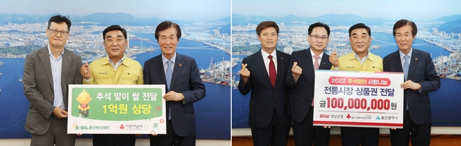 (조세금융신문=구재회 기자) 에쓰오일 울산복지재단과 BNK경남은행 사랑나눔재단이 각각 1억원 상당 백미와 1억원 온누리상품권을 울산사회복지공동모금회에 기탁했다.