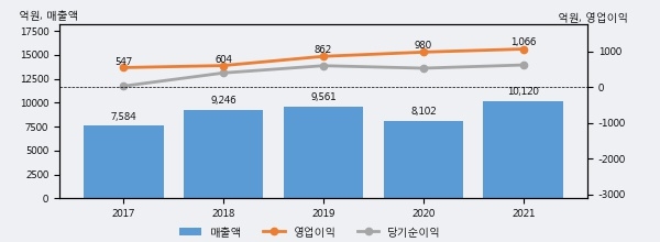 최근 실적을 살펴보면 2021년 매출액이 최근 5년 중 가장 높은 실적을 기록했음을 알 수 있다. 이전 최고 실적이었던 2019년 보다도 5.8%(558억 7천만원) 늘어난 것으로 나타났다.