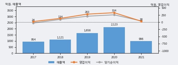 디와이피엔에프의 2021년 매출액은 996억으로 전년대비 -53.1% 하락했고, 영업이익 역시 38억으로 전년대비 -88.7% 하락했다. 이 회사의 매출액 증감률과 영업이익 증감률은 각각 코스닥 하위 3%, 하위 16%에 해당된다.
