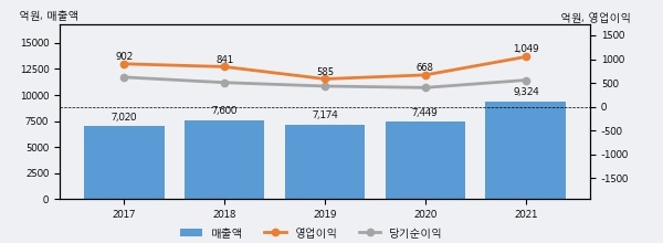 최근 실적을 살펴보면 2021년 매출액이 최근 5년 중 가장 높은 실적을 기록했음을 알 수 있다. 이전 최고 실적이었던 2018년 보다도 22.7%(1724억 2천만원) 늘어난 것으로 나타났다.