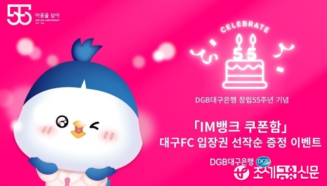 13일 대구은행에 따르면 IM뱅크 쿠폰함 활성화를 위한 행사로, 다음 달 7일 창립 55주년을 기념해 고객 550명에게 쿠폰을 제공한다.