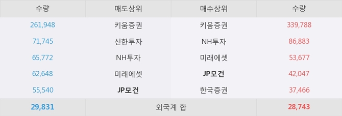 거래원 동향은 JP모건, NH투자, 미래에셋 등이 매수 상위 목록에 나타나고 있다. 한편, 매도 창구 상위에는 JP모건이 눈에 띄고 있다.