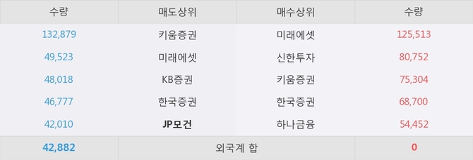 거래원 동향은 미래에셋, 하나금융 등이 매수 상위 목록에 나타나고 있다. 한편, 매도 창구 상위에는 JP모건이 눈에 띄고 있다.
