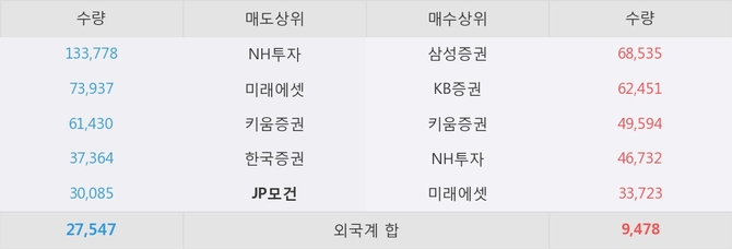 거래원 동향은 JP모건, NH투자, 미래에셋 등이 매도 상위 목록에 나타나고 있다.