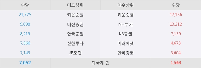 JP모건이 매도상위 창구 5위를 기록중이고, 그 외에 키움증권, 대신증권 등이 매도 창구 상위에 위치하고 있다.