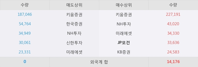거래원 동향은 JP모건, NH투자, 미래에셋 등이 매수 상위 목록에 나타나고 있다.