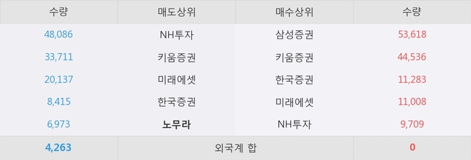 거래원 동향은 삼성증권, 미래에셋, NH투자 등이 매수 상위 목록에 나타나고 있다. 한편, 매도 창구 상위에는 노무라가 눈에 띄고 있다.