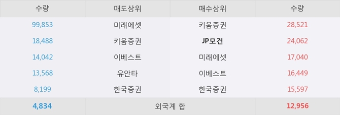 이 시각 주요 거래원은 미래에셋, 키움증권, 이베스트 등이 매도 상위 창구에 자리하고 있다. 한편, 매수 창구 상위에는 JP모건이 눈에 띄고 있다.