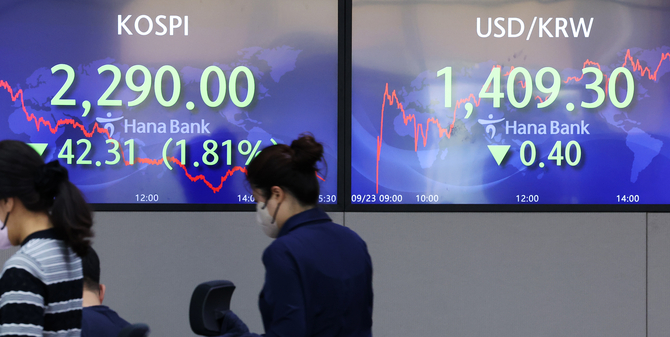 한편, 원-달러 환율이 1400원을 넘어서면서 달러 환산 코스피 지수가 원화 코스피 지수보다 더 크게 떨어졌다. 이날 블룸버그에 따르면 올 초부터 이달 22일까지 G20 국가 주요 지수의 달러표시 환산지수를 비교한 결과 코스피는 33.58% 떨어져 가장 큰 낙폭을 나타냈다.