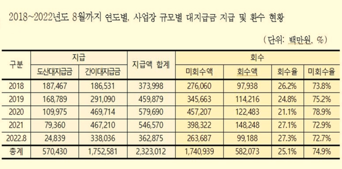 하지만 2조3천230억원 중 회수된 금액은 5천821억원(25.1%)에 불과하다. 특히 사업장 규모가 작을수록 회수율이 낮은 것으로 파악됐다. 규모별 회수율은 5인 미만 19.1%, 5∼49인 26.9%, 50∼299인 34.5%, 300인 이상 56.7%다.