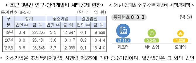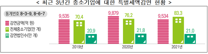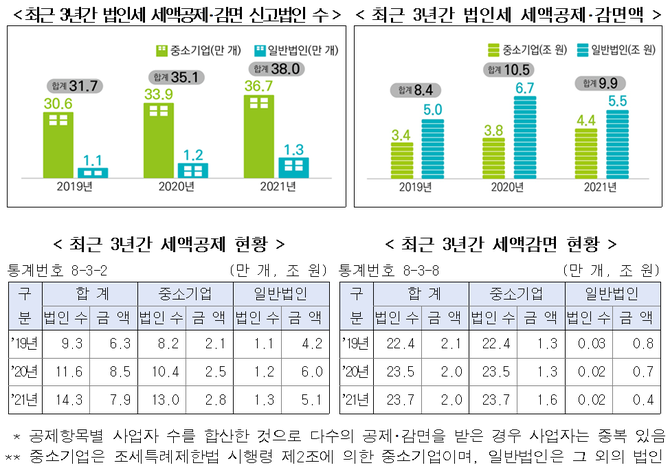 중소기업의 경우 2020년 코로나 시기를 거치며 세금공제 및 감면 규모가 2020년 신고분 3.8조원에서 2021년 4.4조원 늘었다. 1년 사이 기업세금지원 규모가 6000억원 정도 순증한 셈이다.