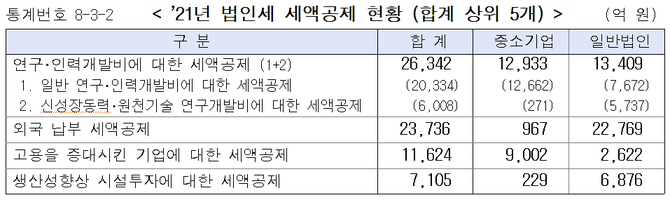 일반법인은 외국납부세액공제가 2조2769억원으로 가장 많았고, 연구・인력개발비 세액공제(1조3409억원)가 그 뒤를 이었다.