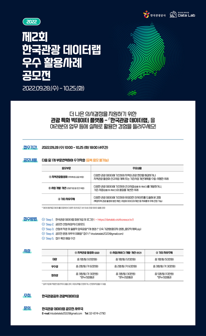 (조세금융신문=송기현 기자) 한국관광공사는 10월 25일까지 '2022 한국관광 데이터랩 우수 활용사례 공모전'을 개최한다.