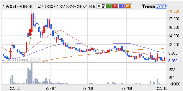 신송홀딩스의 2021년 매출액은 전년대비 -9.4% 줄어든 1864억원이고, 영업이익은 전년대비 33.4% 늘어난 69억원을 기록했다. 이 회사의 매출액 증감률과 영업이익 증감률은 각각 코스피 하위 8%, 상위 46%에 해당된다.
